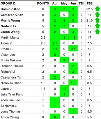 The overall standing, see below, we welcome Shreenidhi (Champion), Shashank, Shayne, Arjun, Henry, Alicia and Mason to Group B next season.